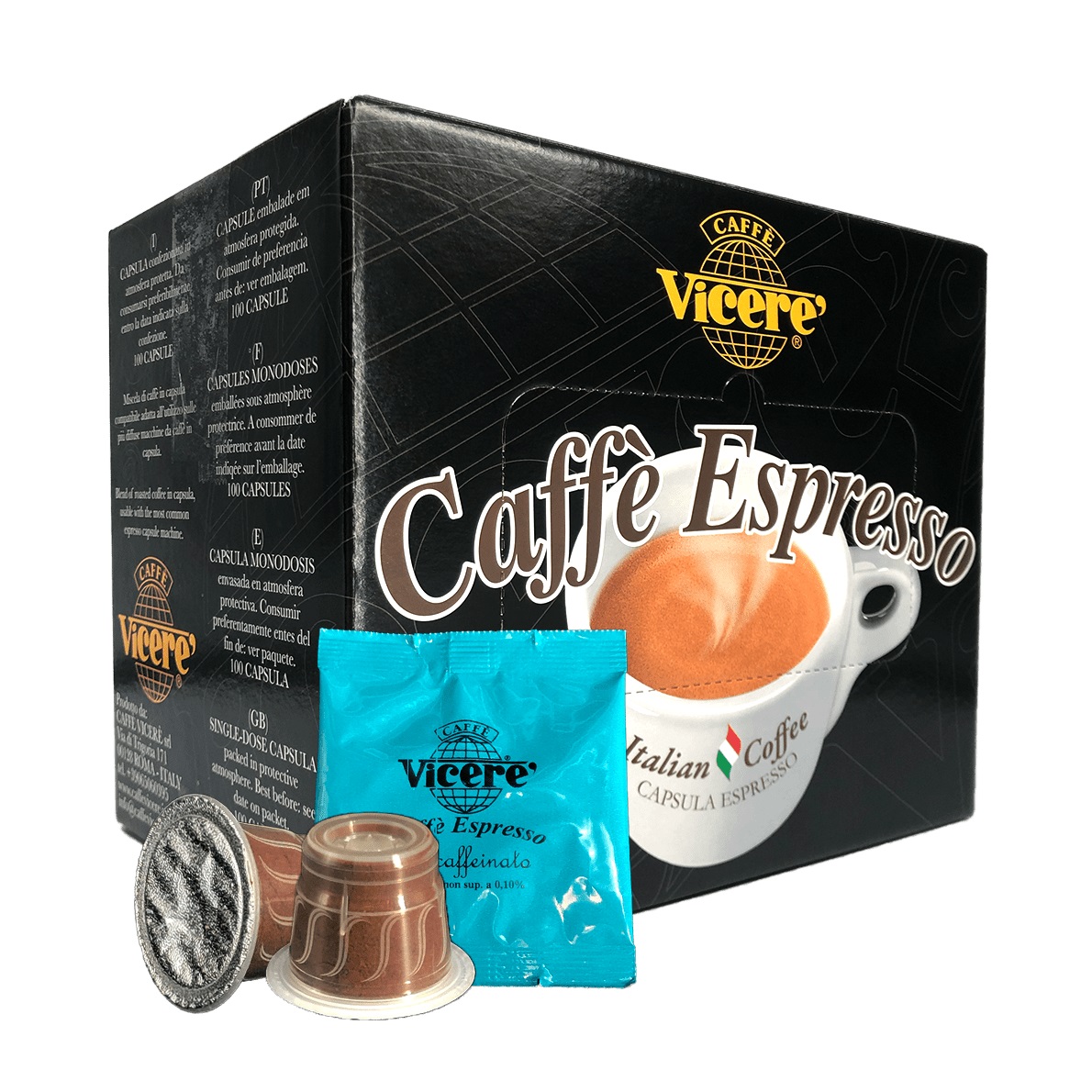 Le Capsule Miscela Decaffeinata Nespresso sono capsule in plastica composte da una miscela di pregiati caffè decaffeinati dal gusto dolce, leggero e liquoroso, perfetta per chi vuole evitare la caffeina senza rinunciare al gusto e alla tradizione italiana, compatibili con le macchine da caffè a marchio Nespresso. Sono ideali per preparare un espresso in capsula amico del cuore, per un piacere senza sensi di colpa. Le capsule Caffè Vicerè contengono 5 grammi di caffè macinato, pressato e confezionato in atmosfera protettiva per garantire inalterato il gusto e il profumo del caffè appena torrefatto.