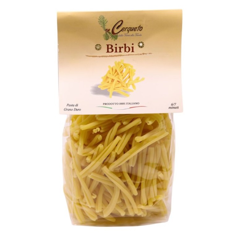 I Birbi sono un tipo di pasta artigianale di semola di grano duro, ottenuta impastando lentamente le semole di grano duro con acqua fredda, cui segue la trafilatura al bronzo, che la rende ruvida e porosa, permettendole di assorbire bene i condimenti, e l’essiccazione a bassa temperatura, procedimento che consente di mantenere i componenti inalterati, preservandone il valore nutritivo, e di conservare il sapore originale. Il risultato è una pasta eccellente dal sapore e gusto unici, come quella fatta in casa, che garantisce il massimo della qualità e della genuinità. I Birbi hanno un’ottima tenuta in cottura e sono ideali accompagnati da ragù di cinghiale o di Cinta Senese.