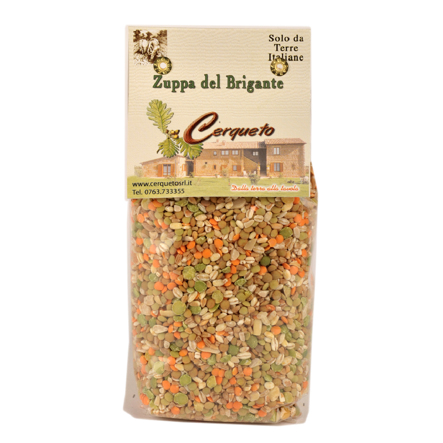 La Zuppa del Brigante è un mix di legumi deliziosi, in cui gli ingredienti naturali e l’assenza di conservanti garantiscono la riuscita di un piatto sano, completo e ricco di gusto, e il cui nome rimanda alla storia, alla leggenda, alle tradizioni popolari che legano i territori dell’Alta Tuscia alle vicende dei Briganti che percorrevano e si rifugiavano in queste terre. Lenticchie verdi, lenticchie rosse decorticate, ceci, fagioli del purgatorio, piselli spezzati, orzo perlato e farro perlato, fanno di questa zuppa un’equilibrata miscela di pregiati legumi e cereali, di facile e uniforme cottura. È buona, genuina e altamente nutritiva in quanto conserva, anche dopo la cottura, tutte le sostanze di cui è ricca.
