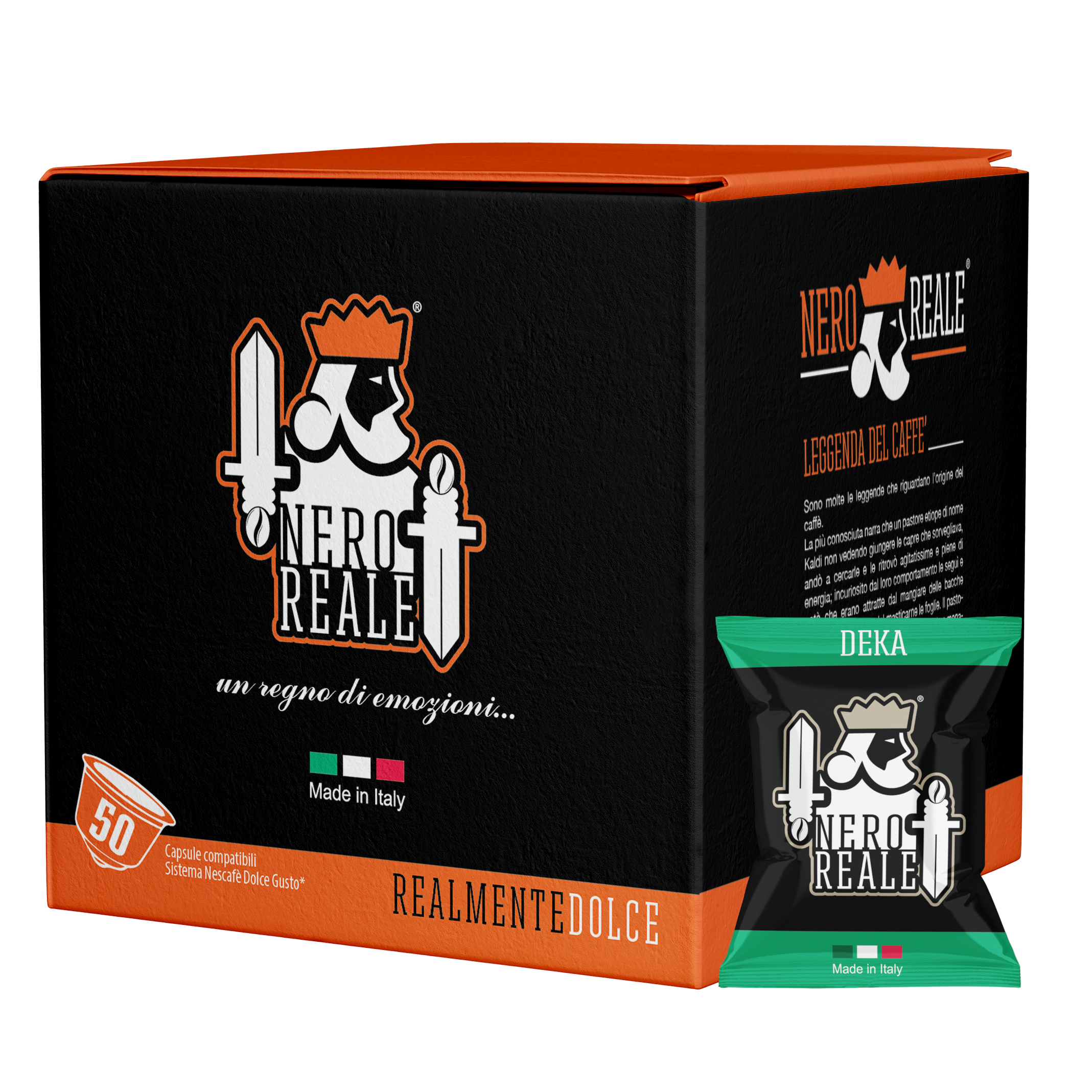 Le Capsule Miscela Deka Dolce Gusto sono capsule in plastica composte da una miscela di caffè leggera e delicata al palato ma senza rinunciare ai tratti tipici di un ottimo espresso, che presenta gli stessi profumi ricchi e lo stesso corpo rotondo della miscela Suprema ma con un basso contenuto di caffeina, rappresentando una piacevole sorpresa, compatibili con le macchine da caffè a marchio Nescafé Dolce Gusto. Le capsule Nero Reale contengono 7 grammi di caffè macinato e confezionato in atmosfera protettiva, con il fine di mantenere inalterate nel tempo fragranza, aroma e gusto.