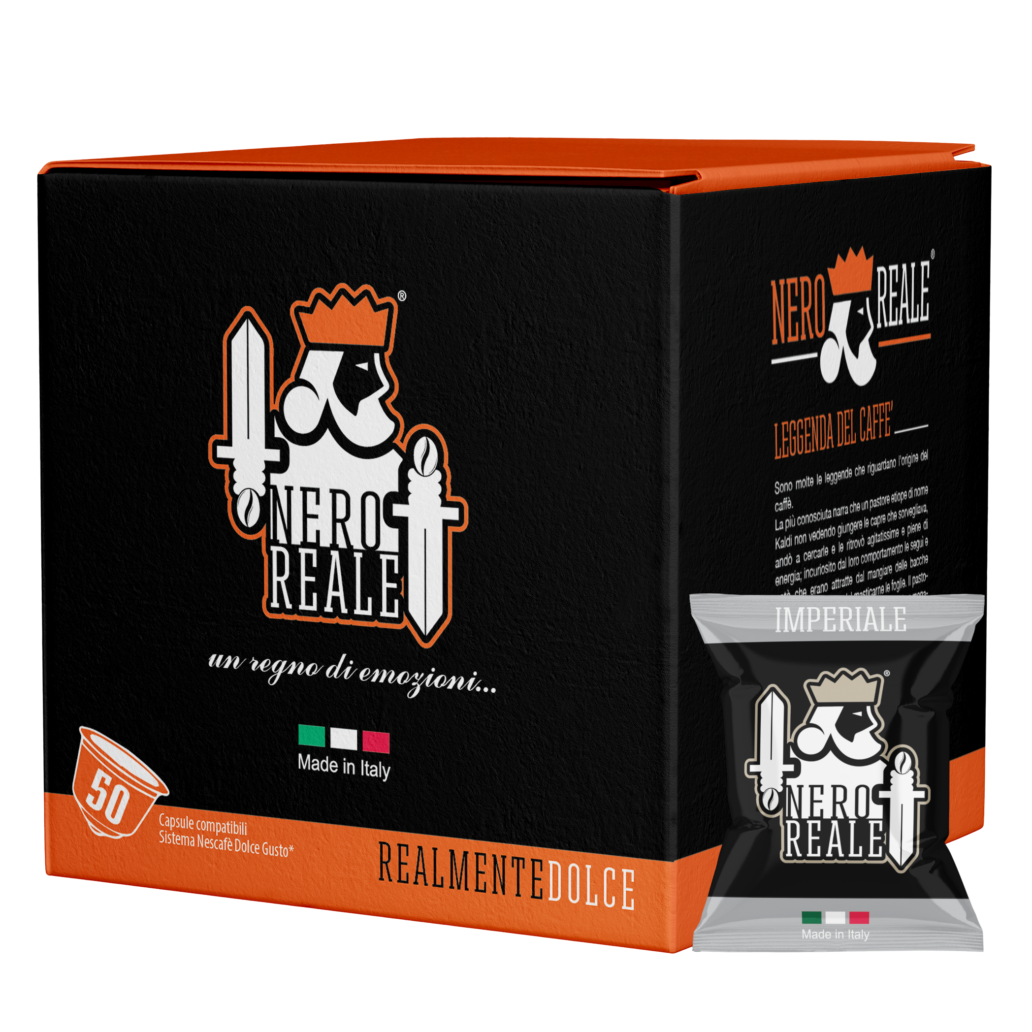 Le Capsule Miscela Imperiale Dolce Gusto sono capsule in plastica composte da una miscela di caffè equilibrato e corposo, cremoso e perfettamente dosato per ottenere un caffè unico degno del tuo bar di fiducia, compatibili con le macchine da caffè a marchio Nescafé Dolce Gusto; l’equilibrio tra selezionate miscele di Robusta provenienti dall’Africa e dall’Asia dona a questa miscela gradevoli note legnose ed un gusto deciso e persistente. Le capsule Nero Reale contengono 7 grammi di caffè macinato e confezionato in atmosfera protettiva, con il fine di mantenere inalterate nel tempo fragranza, aroma e gusto.