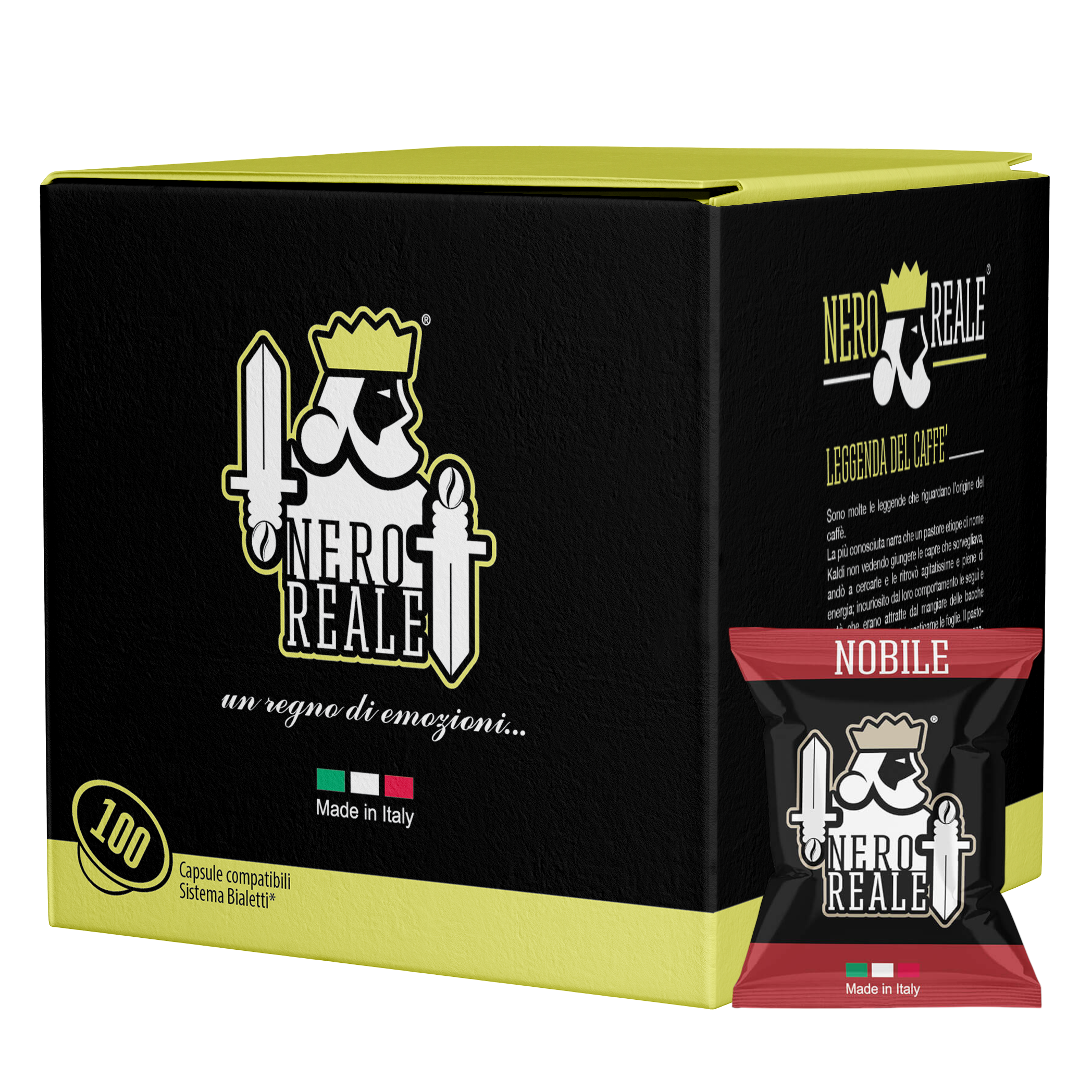Le Capsule Miscela Nobile Bialetti sono capsule in plastica composte da una miscela di caffè 100% Robusta selezionata, cremosa e tostata al punto giusto per ottenere un espresso di grande corpo, dal gusto forte e intenso, dalla consistenza densa e dal sapore marcato, dal carattere deciso e persistente che delizia il palato, ideale per chi cerca sia qualità che convenienza, compatibili con le macchine da caffè a marchio Bialetti. Le capsule Nero Reale contengono 7 grammi di caffè macinato e confezionato in atmosfera protettiva, con il fine di mantenere inalterate nel tempo fragranza, aroma e gusto.